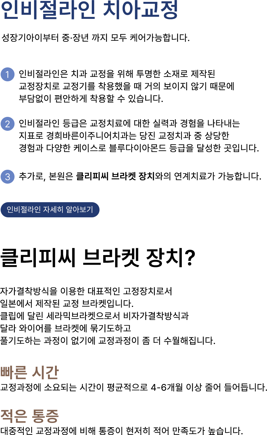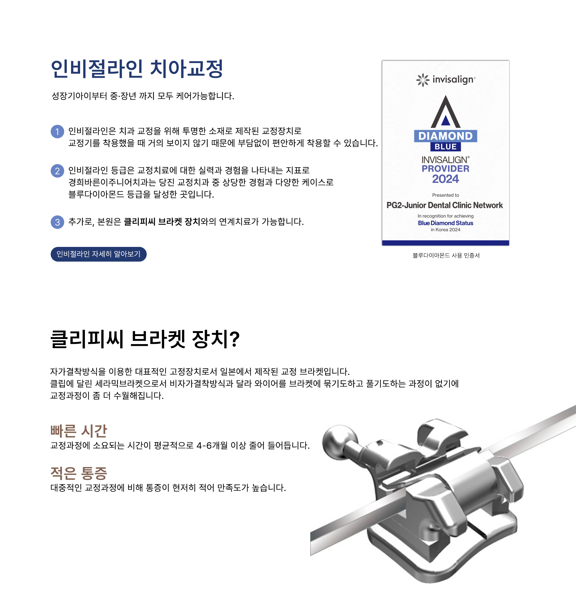 프리올소등 다양한 성장교정장치, 인비절라인, 세라핀 등 투명장치 및 클리피씨 투명브라켓등 모든 종류의 교정치료가 가능합니다.